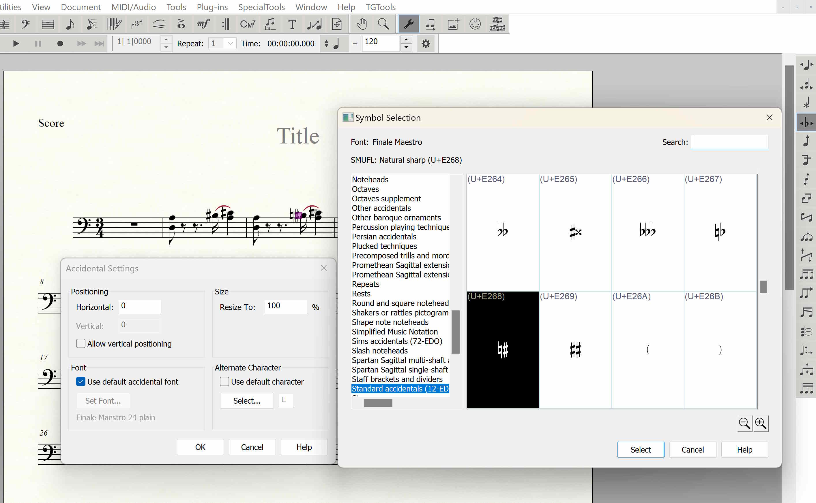 https://github.com/steinbergmedia/bravura) Le caractère dans la police Bravura concernant l'objet de ce post est donc aussi U+E268 (ou le 799 ème de la liste) Pour le reste, la description du procédé reste la même, à ceci près qu'il faut bien sûr décocher aussi "use default accidental font" pour choisir Bravura, une fois celle-ci installée. Et l'espacement de la musique se fait correctement aussi avec ce caractère de Bravura.