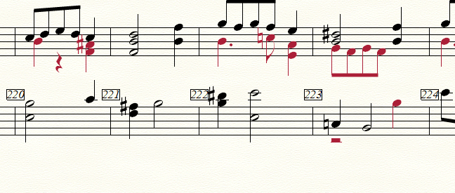 suite à un import avec scanscore, une mesure (la mesure 220) a été mal interprétée par le logiciel et tout ce qui suit se trouve décalé d'un temps. voir piano main gauche sur les images.