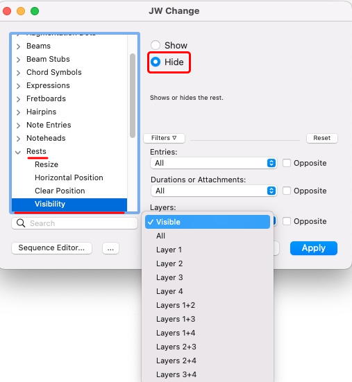 Si vous souhaitez rendre invisibles tous les silences d'une région sélectionnée, le plug-in JW Change (à installer si vous utilisez Finale 26) peut le faire très facilement : Rests ► Visibility ► Hide (avec la possibilité de choisir une couche).