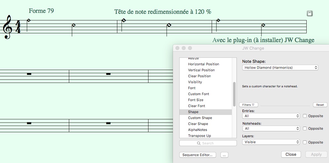 Voyez également (dans cette faq) ce qui concerne le plug-in JW Change, et le script Change Noteheads