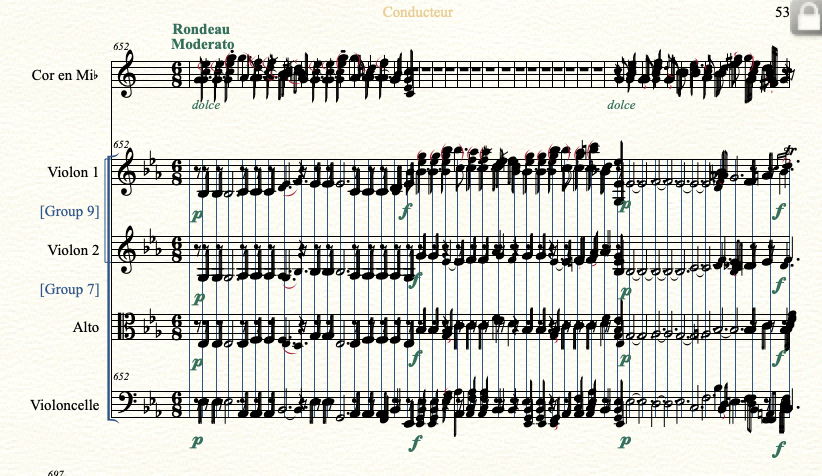 Dans le score, j'avais globalement terminé la mise en page, mais hier j'ai décidé d'espacer un peut plus les derniers systèmes du 2e mouvement. Les mesures déplacées se sont donc ramassées dans le premier système du 3e mouvement.