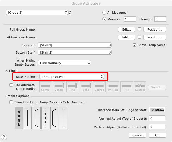 Dans la fenêtre "Attribut de groupe" pour les portées, je sélectionne "Barres de mesures sur les portées".