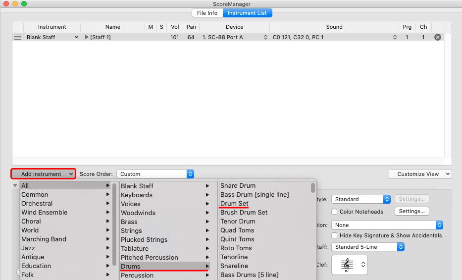 Créez un nouvel instrument, puis allez dans Drums ► Drum Set.