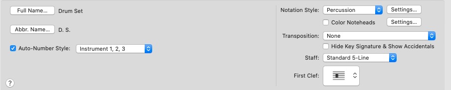 Finale se charge d'attribuer les paramètres adéquats à la nouvelle portée. Nom, clé, portée à 5 lignes, attribution des sons, canal midi 10, notation de type "percussion".