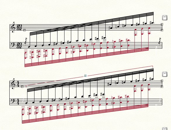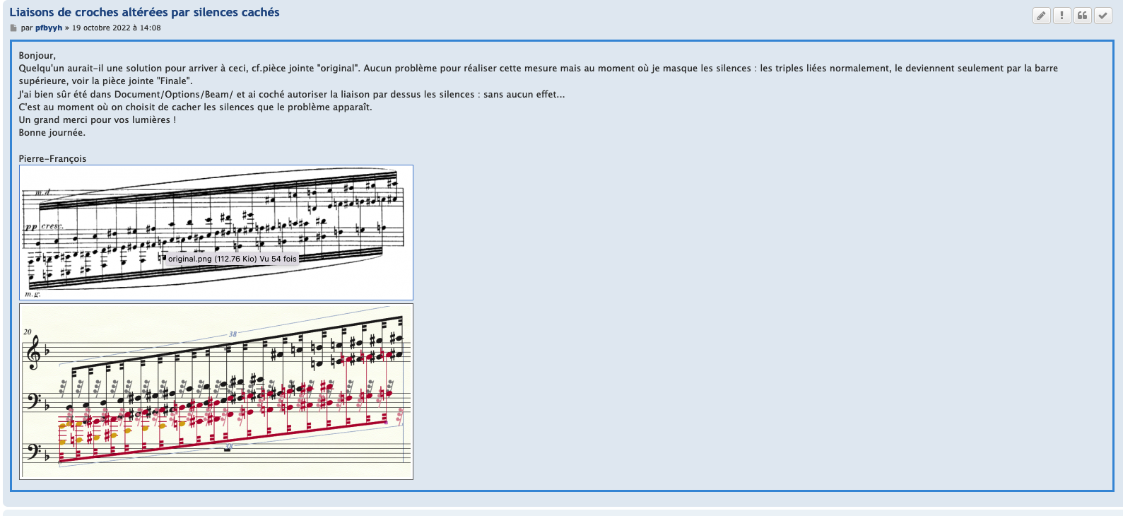 Oui, justement c'est ce que j'aimerais pouvoir court-circuiter ! J'ai une mesure de cadence (4/4, 2 bémols à l'armure) qui passe d'une portée à l'autre (clés différentes) en notes alternées, composée d'un n-olet de 38 triple-croches. Pour simplifier le tout, c'est à l'octave, une fois supérieure, une fois inférieure... Comme Finale est incapable d'écrire les liaisons de triples au-dessus de silences cachés, j'ai dû utiliser la technique qu'Odile m'a gentiment indiquée - qui fonctionne très bien en l'absence d'altérations !