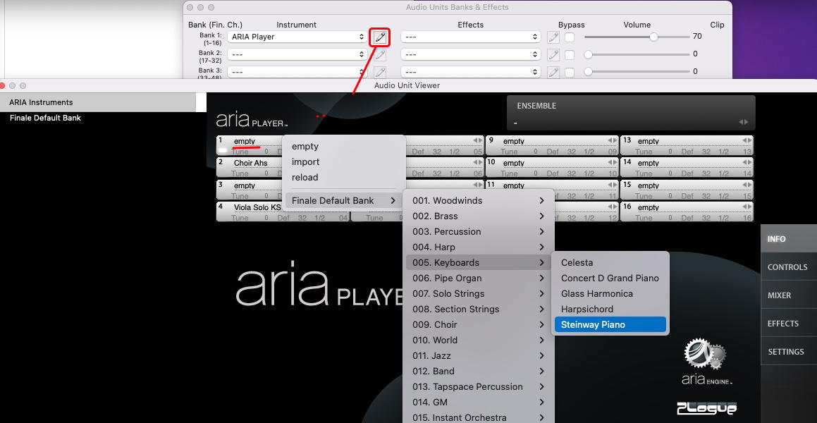 En détail : menu Midi/Audio ► Audio Units... ► cliquez sur le crayon à droite d'Aria Player. Cliquez sur le premier instrument (qui affiche "empty") pour accéder à Finale Default Bank ► Keyboards ....
