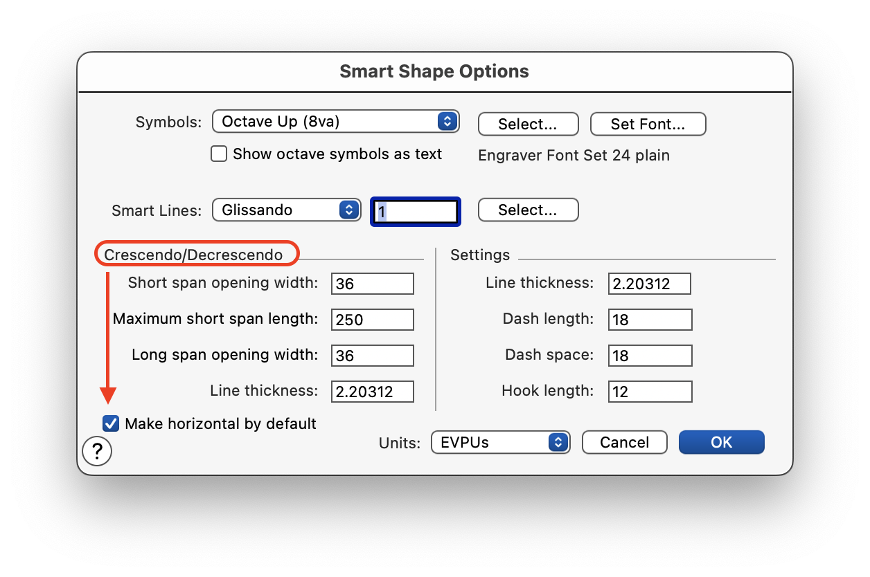 Enfin, j'ai bien décoché la case "horizontal par défaut", mais ça ne fonctionne toujours pas. Le menu "lignes avancées ("Smart lines") indique glissando et d'autres choses mais pas les signes crescendo.